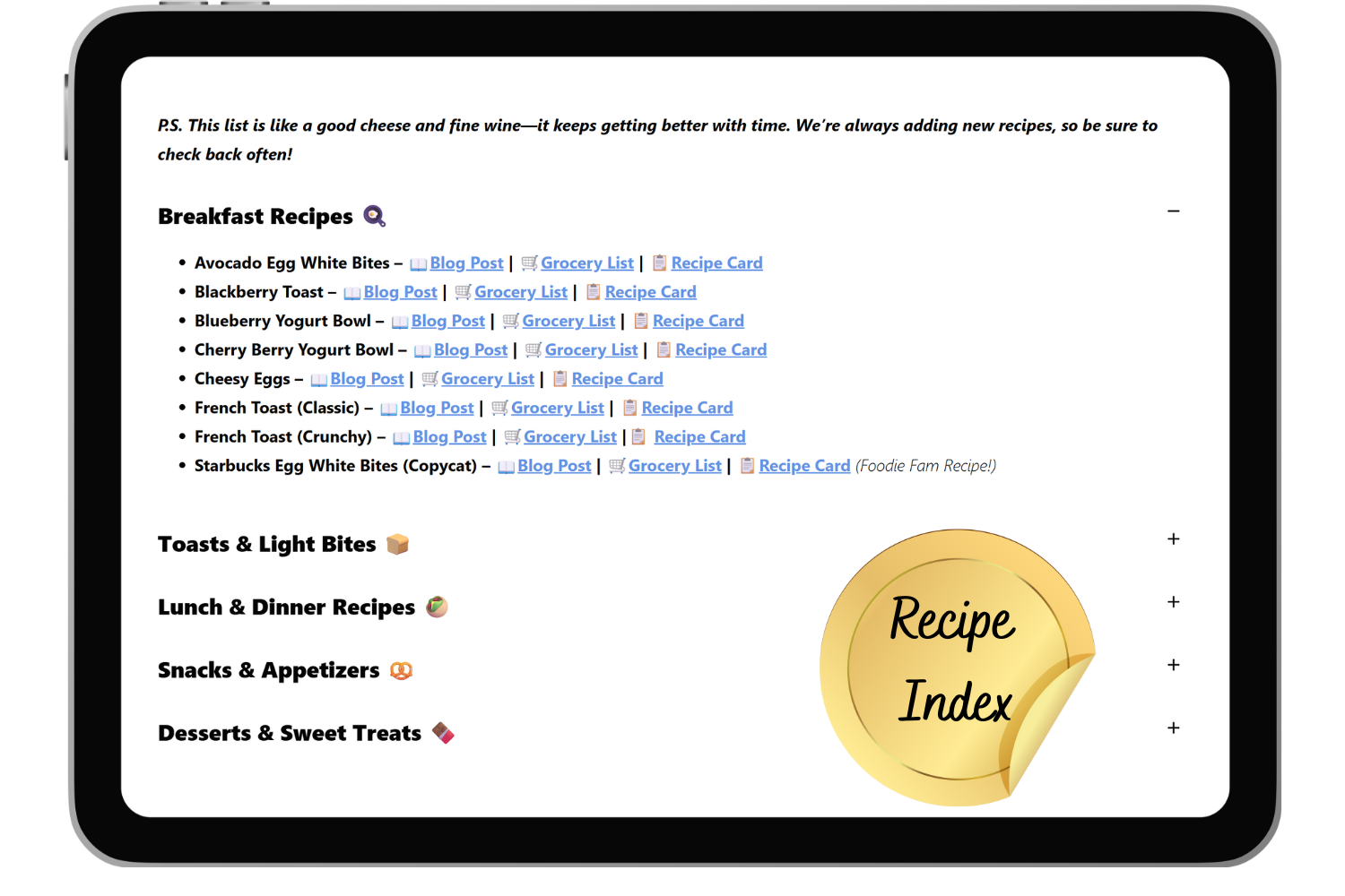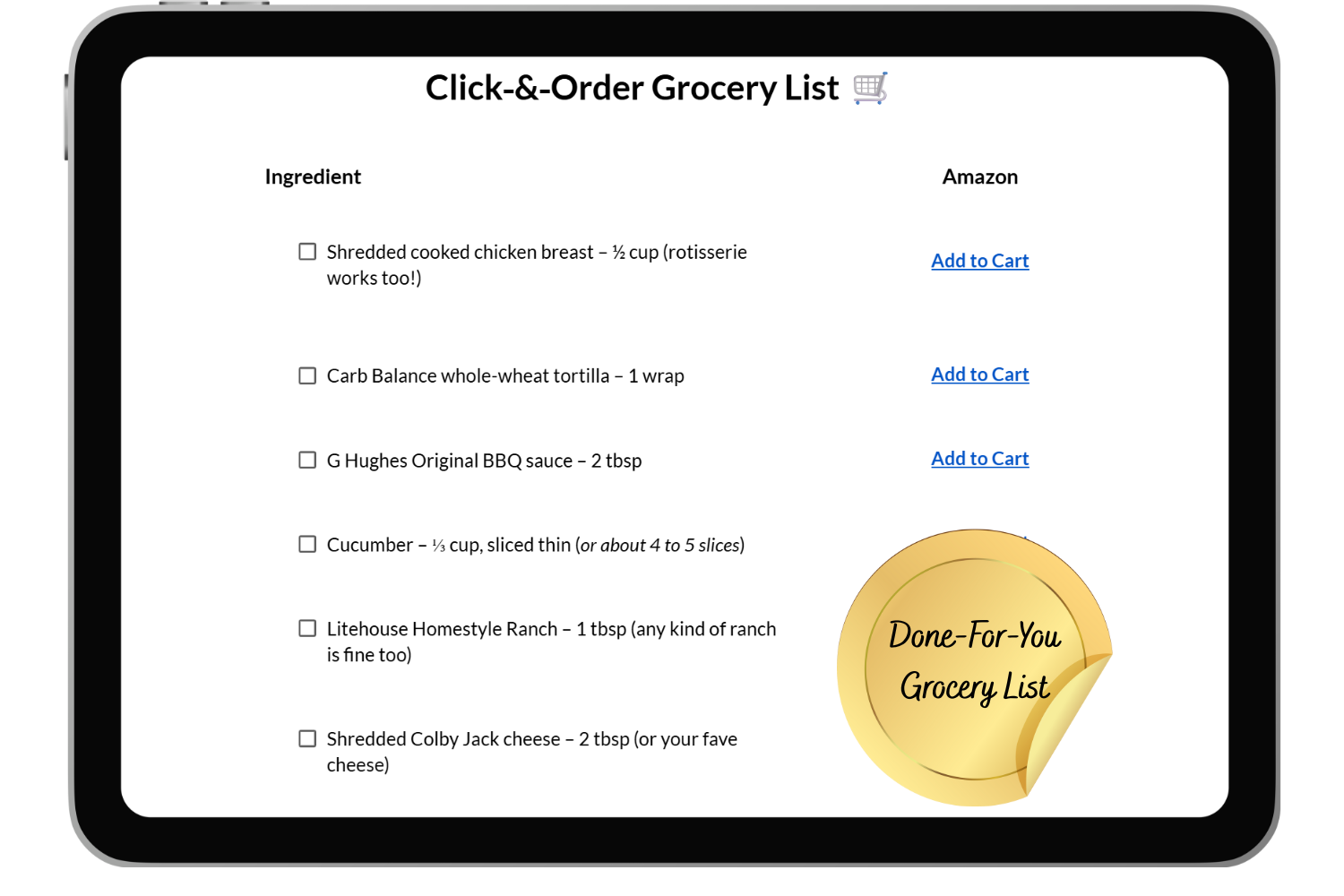 ✔️ Every recipe includes a done-for-you grocery list you can use two ways: Click and order—done! Or check it off like a classic list.